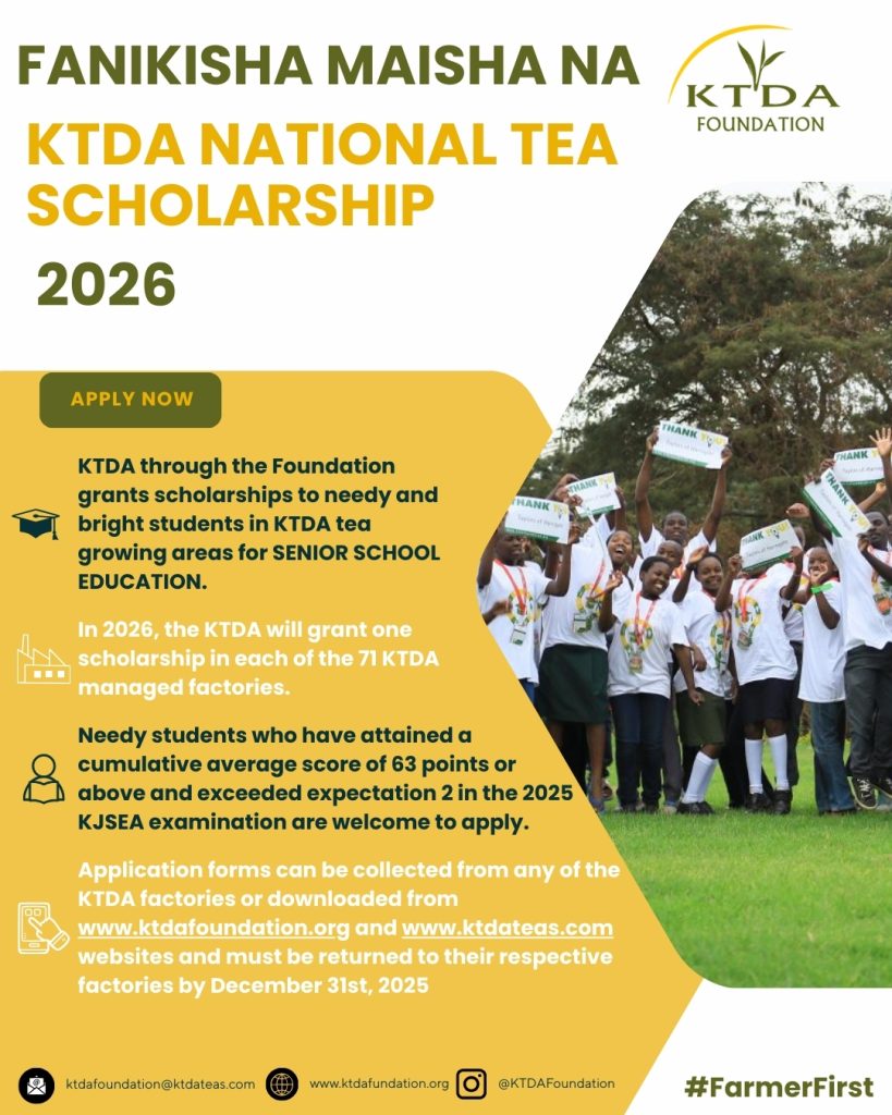 Education is a cornerstone of sustainable development and a key pillar of the work undertaken by KTDA Foundation. Through the Fanikisha Maisha na KTDA National Tea Scholarship 2026, the Foundation continues to invest in the academic potential of bright but needy students drawn from KTDA tea-growing communities. The scholarship is designed to support access to senior school education, recognising this stage as critical in shaping future leaders, professionals, and change-makers. By prioritising education, KTDA Foundation is strengthening human capital within tea-growing regions and laying the foundation for long-term social and economic transformation.In line with its Education Pillar, the Foundation will award one scholarship in each of the 71 KTDA-managed tea factories in 2026, ensuring equitable access and community-level impact. Eligible students must demonstrate both academic merit and financial need, having attained a cumulative average score of 63 points and above and exceeded Expectation 2 in the 2025 KJSEA examinations. Application forms are available at all KTDA factories and online through the Foundation’s official platforms, with completed submissions required to be returned to the respective factories by 31st December 2025. This decentralised approach reinforces transparency, inclusivity, and local ownership in the scholarship selection process.The Fanikisha Maisha initiative is a direct reflection of the Farmer First mantra that underpins all KTDA Foundation interventions. By investing in the education of farmers’ children, the Foundation acknowledges that sustainable tea production begins with empowered families and resilient communities. Educated children are better equipped to support their households, contribute to community development, and drive innovation across generations. Through this scholarship, KTDA Foundation reaffirms its commitment to placing farmers and their families at the centre of development — ensuring that opportunity, dignity, and hope are accessible to every deserving child in Kenya’s tea-growing areas.